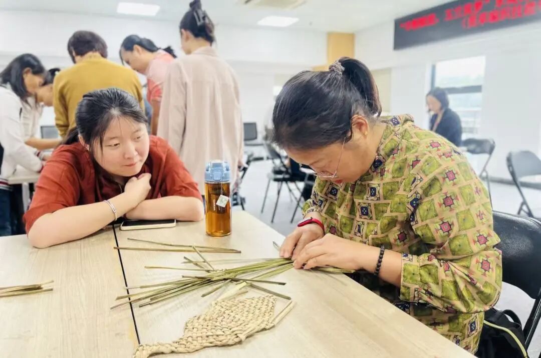 活动现场,叶老师从莞草的选材、浸泡、编织技法讲起,亲手示范用两根粗莞草条交叉作“经”,另两根上下穿插为“纬”,“编的时候像织毛衣,压一挑一,缝隙要均匀,不然烧鹅身体‘漏气’就不好看了。”教学过程中,有姐妹怎么都编不成型,叶老师亲身示范调整草条松紧,纠正歪斜的编织纹路。参加者玲姐反复研究练习,编出了饱满的“烧鹅头”,获得其他人的争相学习:“没想到编个鹅头要这么讲究,非遗技艺真是藏在细节里。”