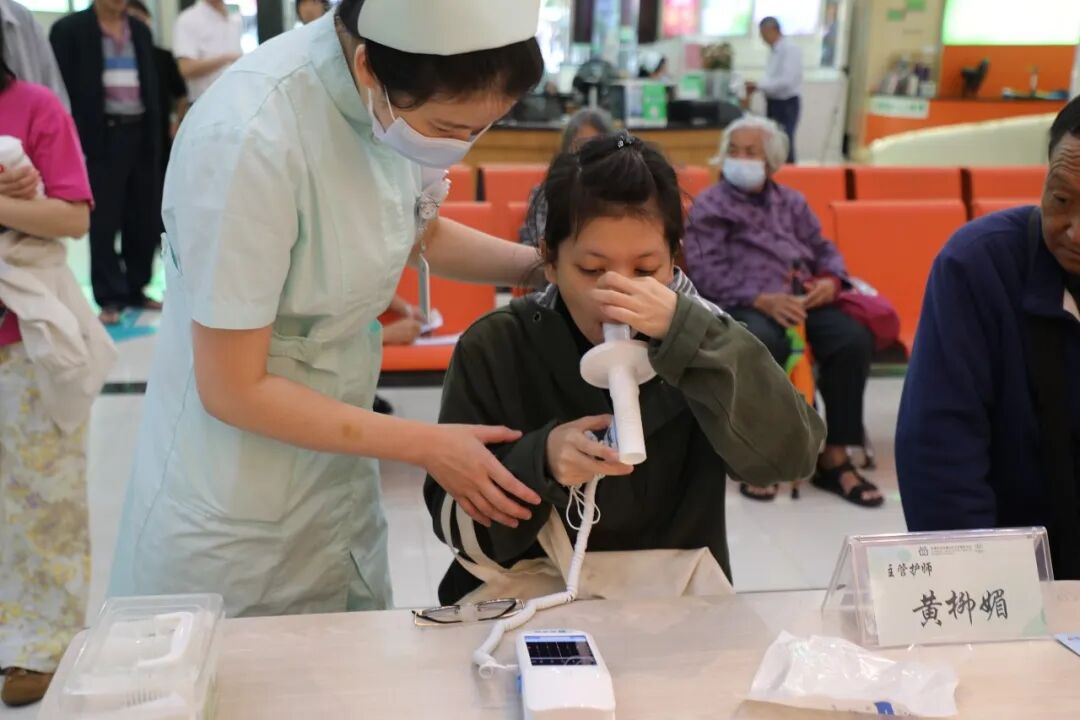 在肺功能检查区,医护人员专注地为居民进行免费检测,并耐心指导每一位受检者。“请深吸一口气,然后慢慢呼出来……”他们一边操作仪器,一边细致地讲解检查流程。现场特设的吸入装置教学去尤为受欢迎,专家们“手把手”地指导患者正确使用吸入药物,及时纠正许多日常使用中的误区。