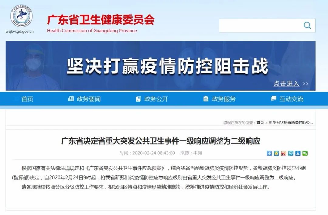 今天(2月24日)上午,广东省卫生健康委发布信息:省新冠肺炎防控领导小组(指挥部)决定,自2020年2月24日9时起,将广东省新冠肺炎疫情防控应急响应级别由省重大突发公共卫生事件一级响应调整为二级响应。(早前报道:广东省决定省重大突发公共卫生事件一级响应调整为二级响应)由一级响应调整为二级响应,意味着什么?