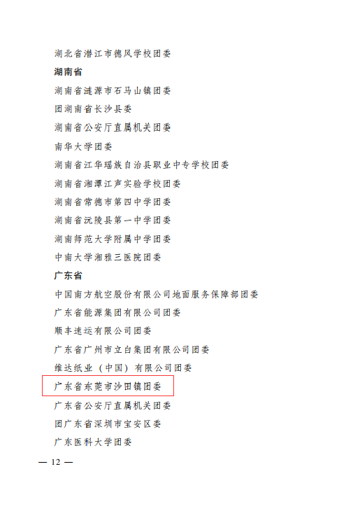 今年4月,共青团中央办公厅印发《共青团中央关于表彰全国五四红旗团委(团支部)、全国优秀共青团员、全国优秀共青团干部的决定》,广东省有17个团组织被授予全国五四红旗团委( 团工委) 称号,沙田镇团委作为东莞市唯一一个获表彰的单位,也是首次获得此项荣誉。