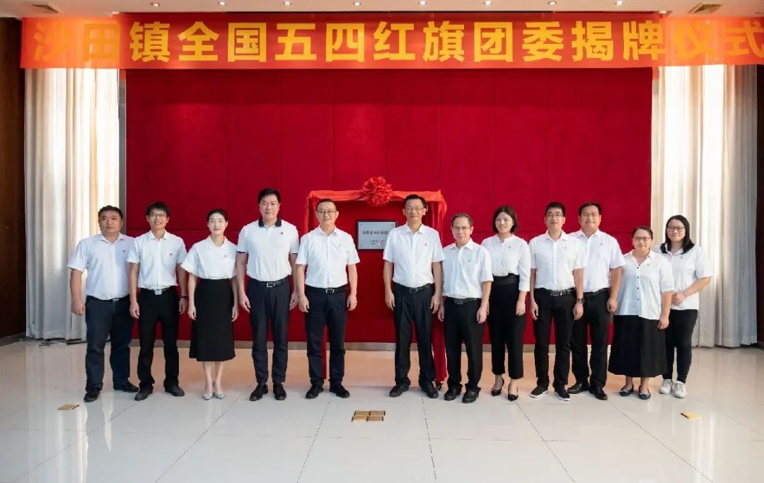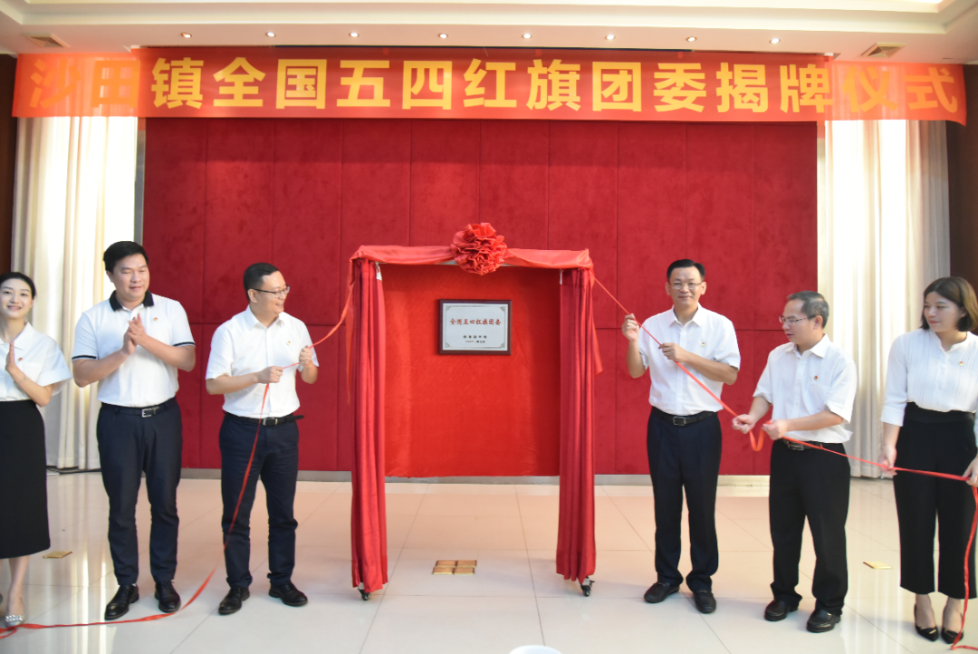 9月18日上午,团市委副书记严正、镇委副书记袁树坚、镇人大主席候选人卢泽新、团市委组织部部长叶炽高等领导共同为全国五四红旗团委进行了揭牌。
