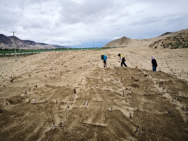 在山南市雅鲁藏布江河谷地带,村民们在维护固沙用的草方格(2019年7月14日摄)。新华社发(资料照片)