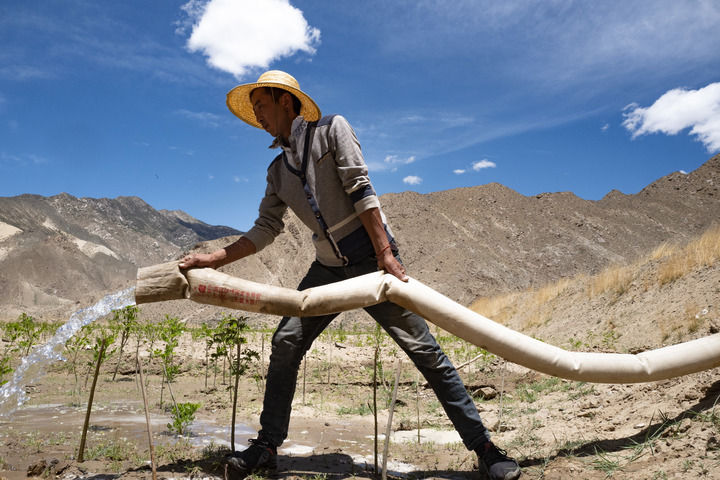 山南市贡嘎县吉雄镇刘琼村村民正在为树苗浇水(6月2日摄)。新华社记者 普布扎西 摄
