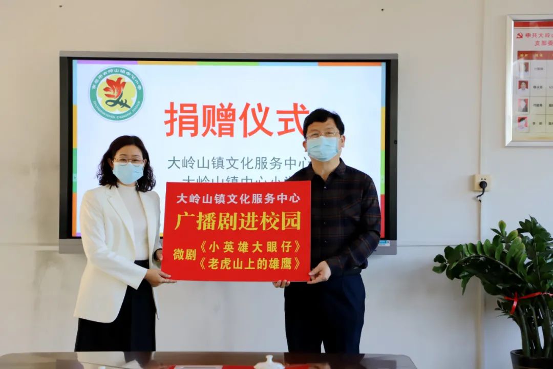 ▲ 大岭山文化服务中心负责人杨继春为中心小学送上原创广播剧