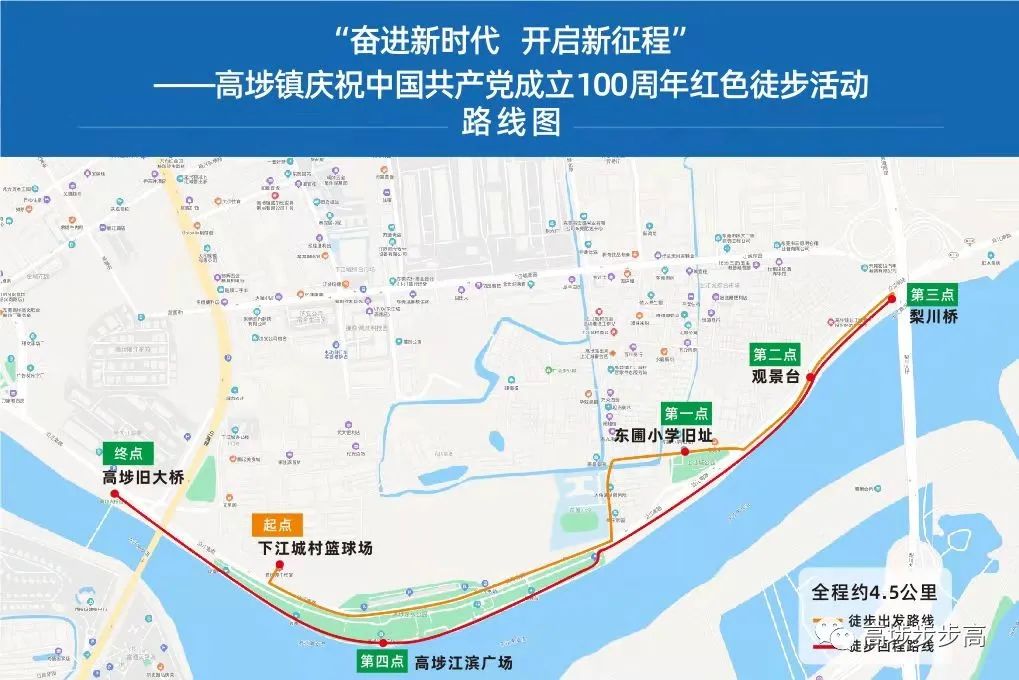 主办方介绍,本条线路全程约4.5公里,其中包含了东圃小学(旧址)、一环亲水绿道观景台、高埗大桥(旧址)、东江梨川大桥,分别代表高埗革命战争时期、改革开放时期以及中国特色社会主义新时代3个不同时期的经济社会发展成果。